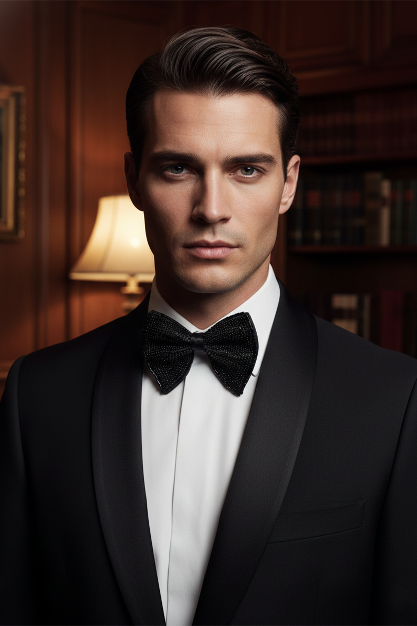 Add bold elegance to your formal wardrobe with this Black Embroidered Beaded Statement Bow Tie. Designed on a rich black satin base, this piece features dense hand embroidery combined with intricate bead embellishments arranged in a striking symmetrical pattern. The detailed black-on-black beadwork creates a refined texture and subtle shine, making it ideal for weddings, receptions, cocktail parties, red-carpet events, and luxury evening wear. Its structured butterfly silhouette delivers a sharp, polished look, while the adjustable strap ensures a secure and comfortable fit.