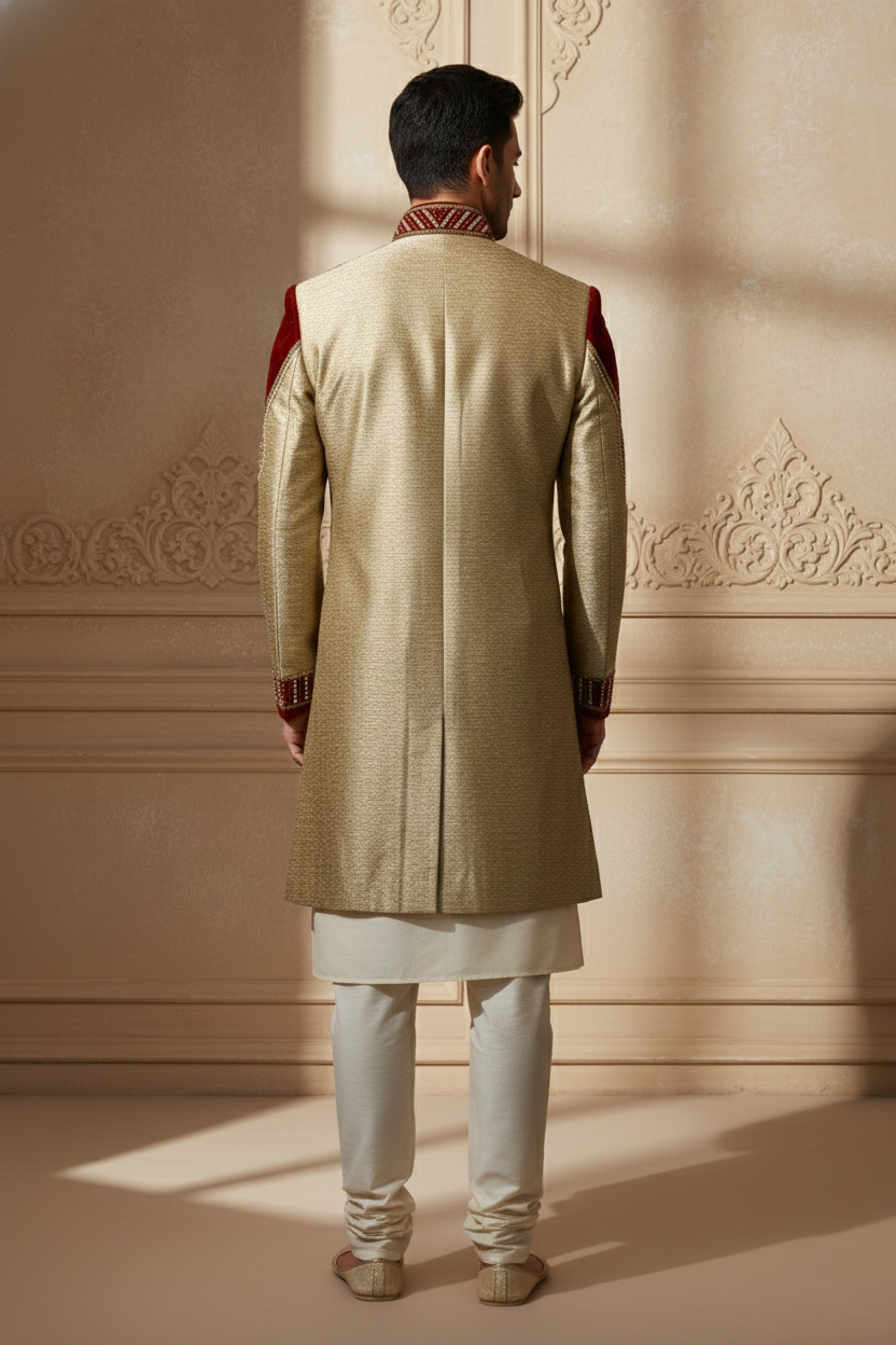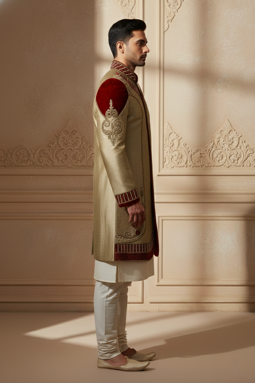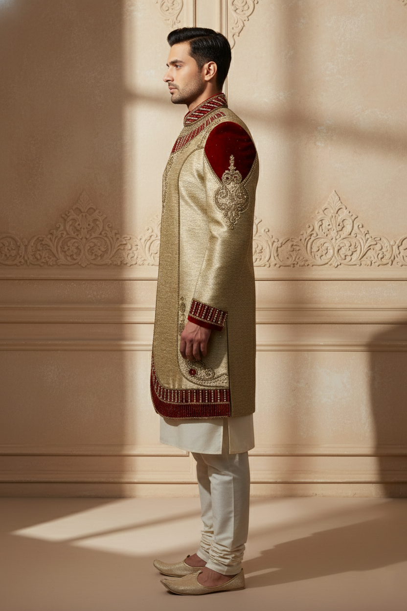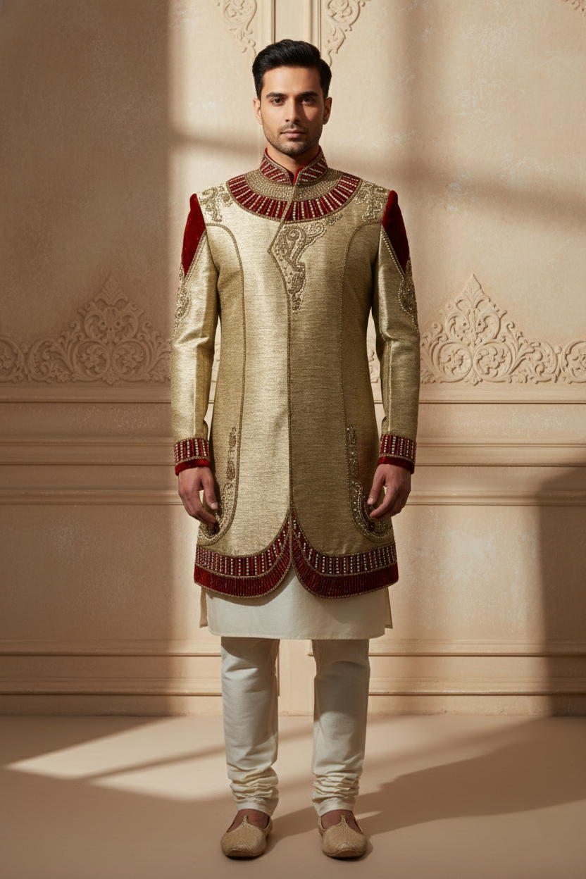 This gold sherwani, richly adorned with intricate red and gold embroidery, is a masterpiece of ceremonial elegance. Featuring ornate detailing across the collar, cuffs, shoulders, and hemline, it radiates regal sophistication. Paired with a cream kurta and churidar pants, along with traditional juttis, this ensemble is perfect for weddings, receptions, and festive occasions—blending heritage craftsmanship with a luxurious modern silhouette.
