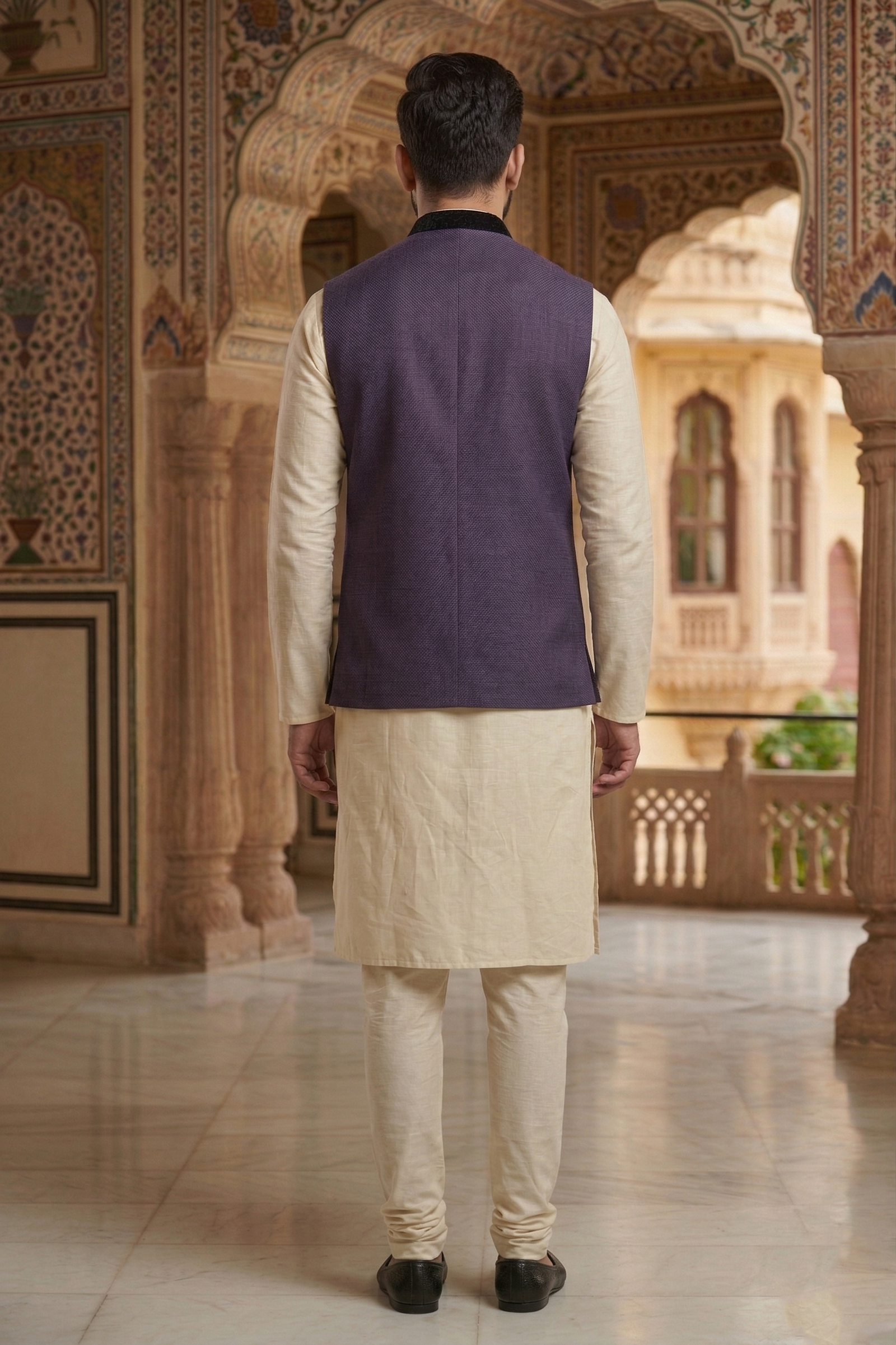 Command the spotlight with our Men’s 3-Piece Royal Purple Ethnic Ensemble. This designer set features a premium Purple Nehru Jacket crafted from a high-definition textured fabric that offers a sophisticated matte finish. The jacket is uniquely accented with black velvet detailing on the mandarin collar and pocket flaps, providing a luxurious touch of contrast and texture.